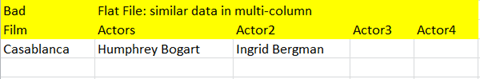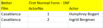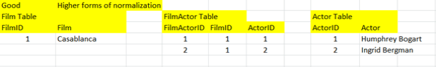 This uses multiple tables to remove data duplication. In the example above the film title “Casablanca” appears more than once. If more films were added the actor names would also appear more than once. In the example below the title and actors appear only once and are subsequently referred to by their IDs, in this case in the FilmActor table.