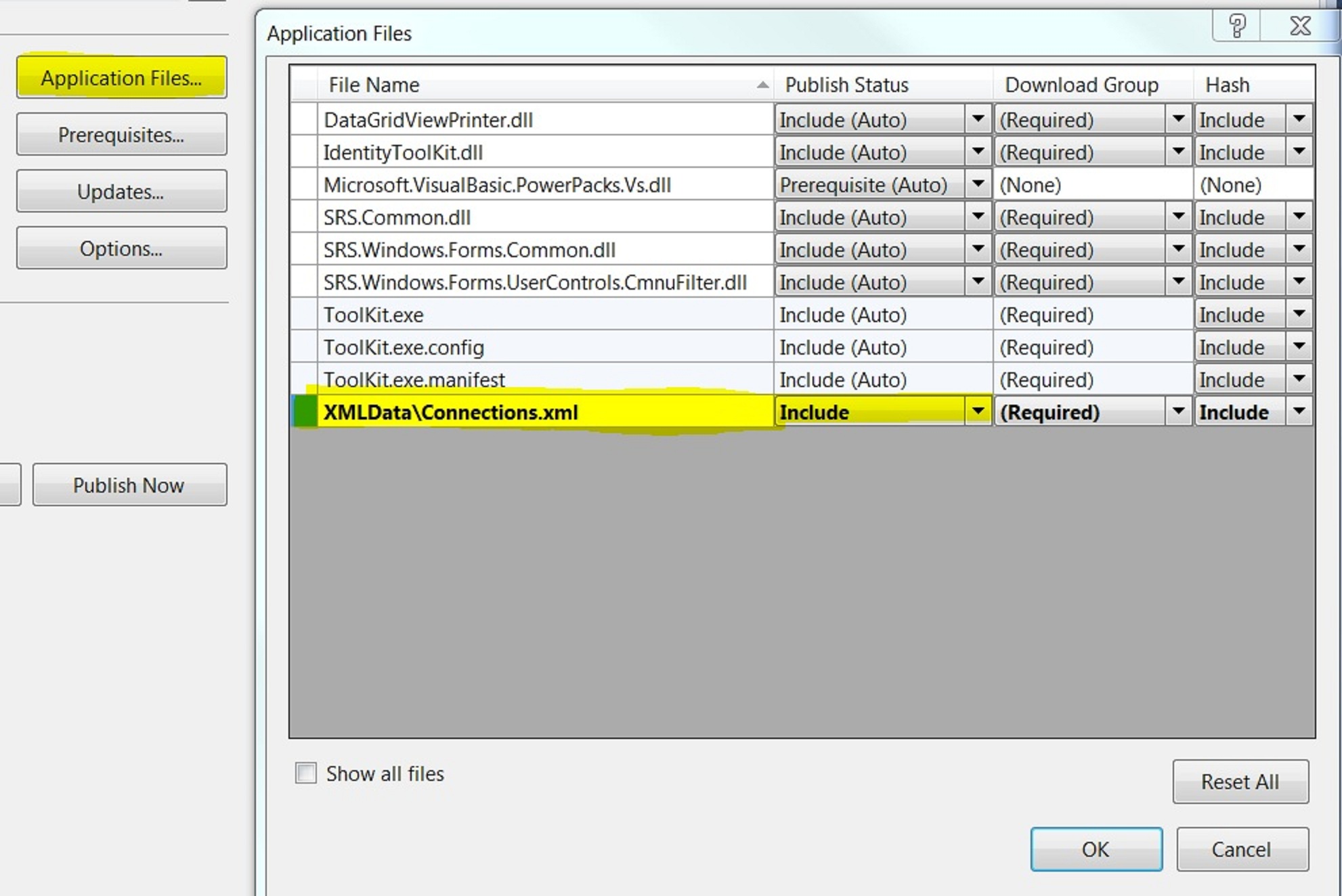 On Project > Properties > Publish > Application Files > Find <FileName>.xml file and set Publish Status to “Include”
